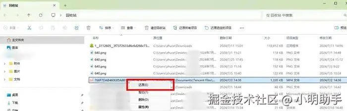 步骤2: 在回收站中找到丢失的视频文件,按下后点击鼠标右键,唤起快捷操作列表;