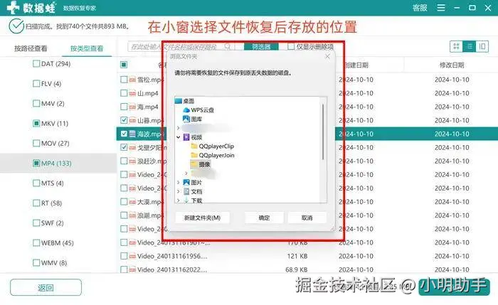 步骤3: 在【浏览文件夹】中选择恢复出来的视频另外存储的位置。