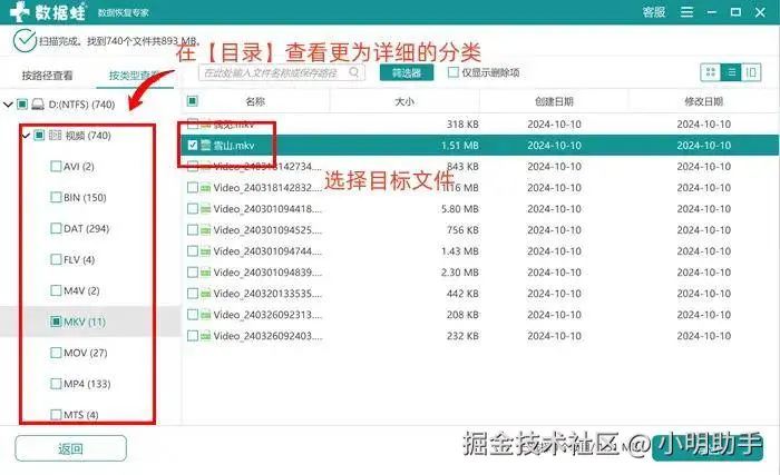 步骤2: 耐心等待软件扫描完成后,在左侧的目录还能查看更为详细的文件分类,点击筛选类型后更快找到目标文件;勾选出目标文件后,点击【导出】。