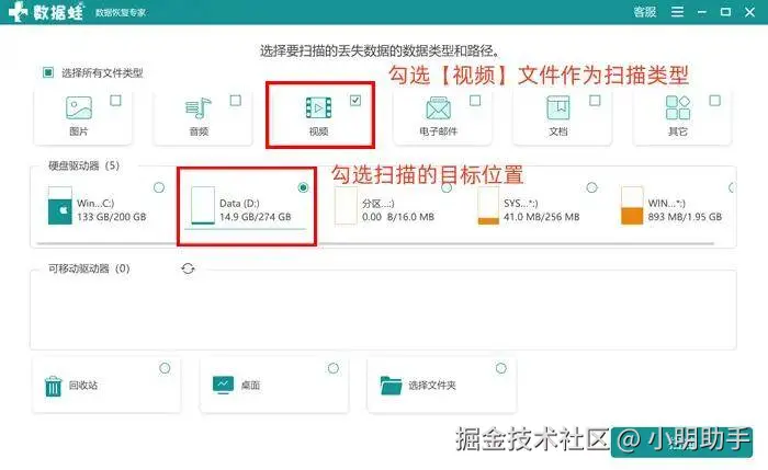 数据 蛙恢复专家能让用户自由设计需要的数据恢复方案,可供选择的文件类型中就有视频,还能直接选择误删视频的位置进行扫描。怎样找回错删的视频?利用数据 蛙恢复专家强大的扫描能力,我们就有有很大的概率将误删的视频找回。