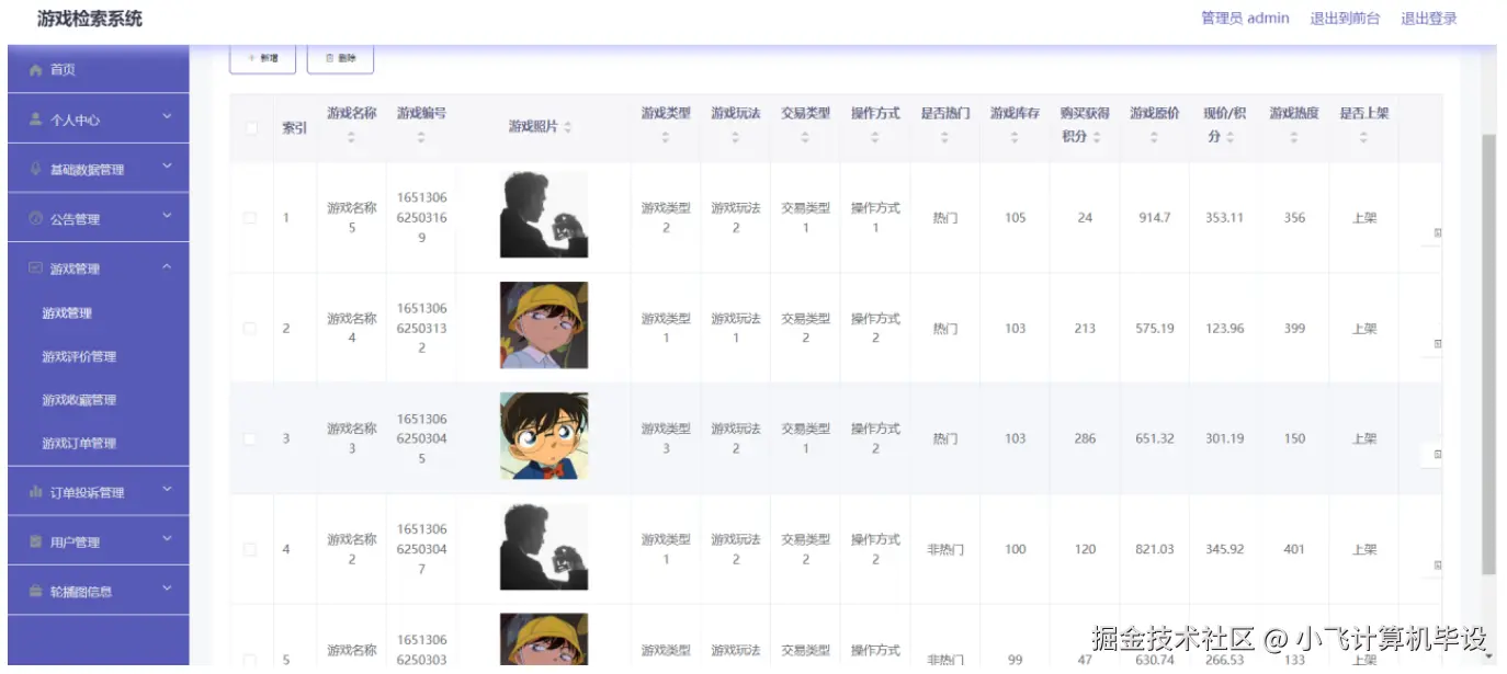 - 游戏新增:管理员在后台填写游戏信息(名称、类型、价格、库存),上传游戏截图,设置 “是否上架” 状态;