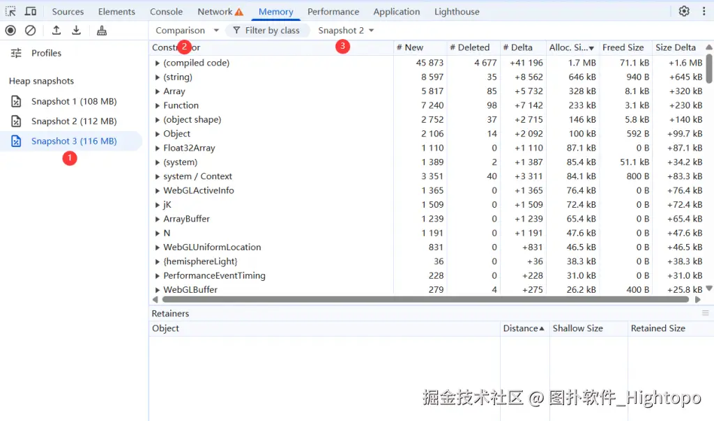 在完成以上的操作步骤后,选择第三个快照,并在顶部的视图选择器中(下图 ②),将视图模式从 Summary 切换为 Comparison,比较对象选择为快照 2(下图 ③)。现在视图只会显示快照 2 和快照 3 之间发生变化的对象。操作后需要关注以下内容: