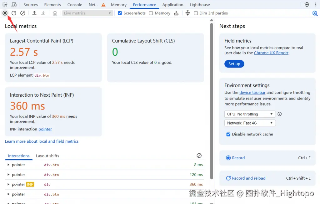 在实验操作前,我们可以打开 Chrome DevTools -> Performance (性能) 面板,并且点击面板中的录制按钮,记录整个实验过程,这能帮助我们在操作结束后,回溯并分析全程性能和内存的变化情况。