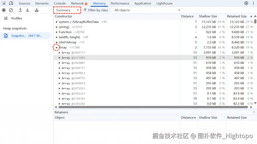 在上图所示的摘要中,每一项都支持展开,展开后可以看到对象的完整引用链。摘要面板适合的运用场景:当单次 Profile 已显示出大量的内存占用时,可先按 Retained Size 对列表进行排序,快速定位到占据了过高的内存的项,展开其中的可疑目标并一路追溯,直到找到根源 —— 通常是挂载到全局 windows 对象上的变量,或被闭包捕获的变量。