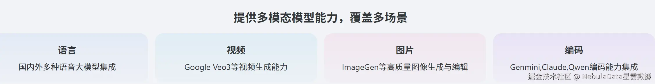 Nebula API 不局限于单一模态,而是提供多模态能力,覆盖多场景,包括语言、视频、图片、编码等。这使得开发者可以轻松地将多种AI能力组合起来,构建更复杂、更智能的应用,例如: