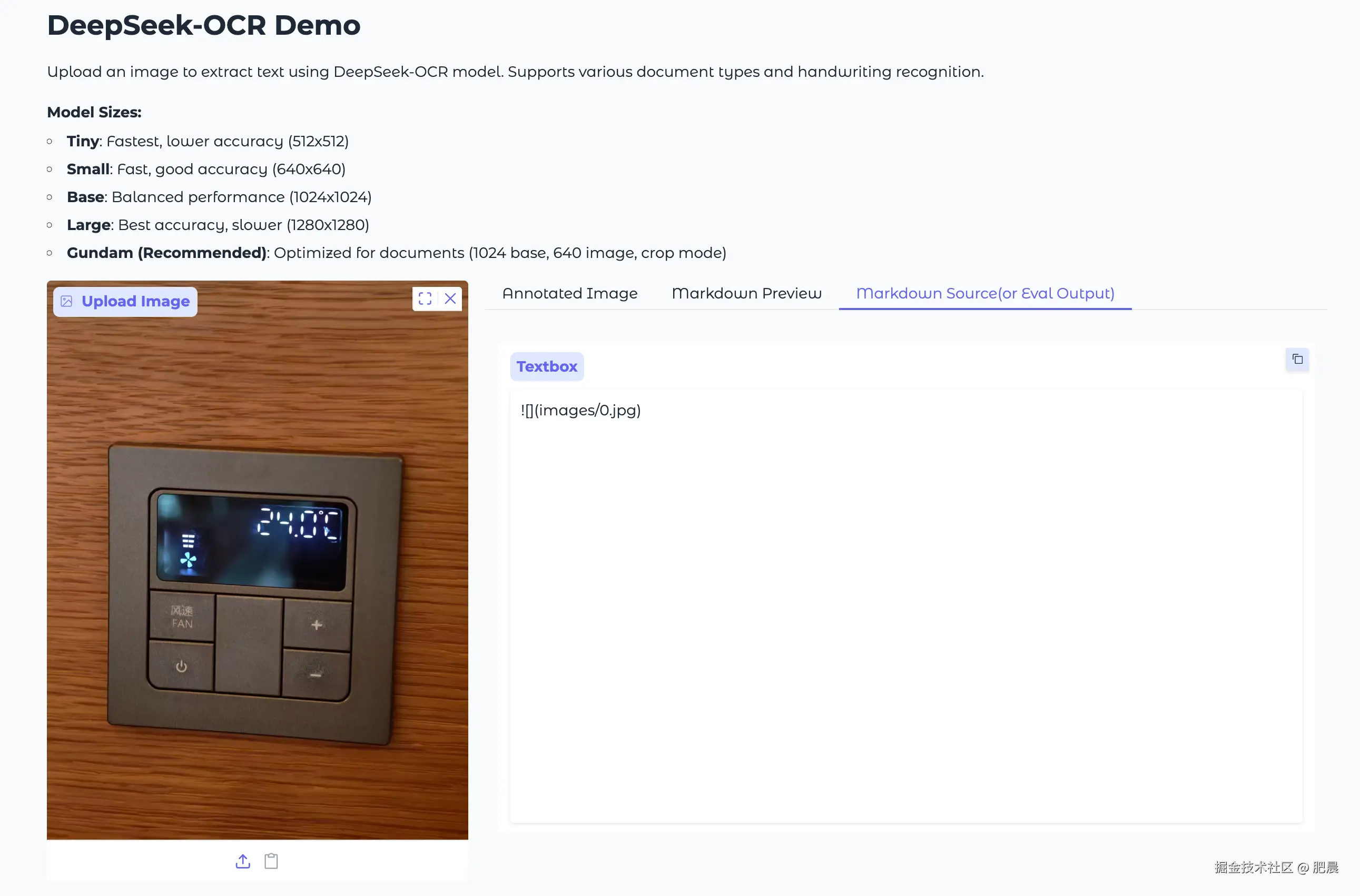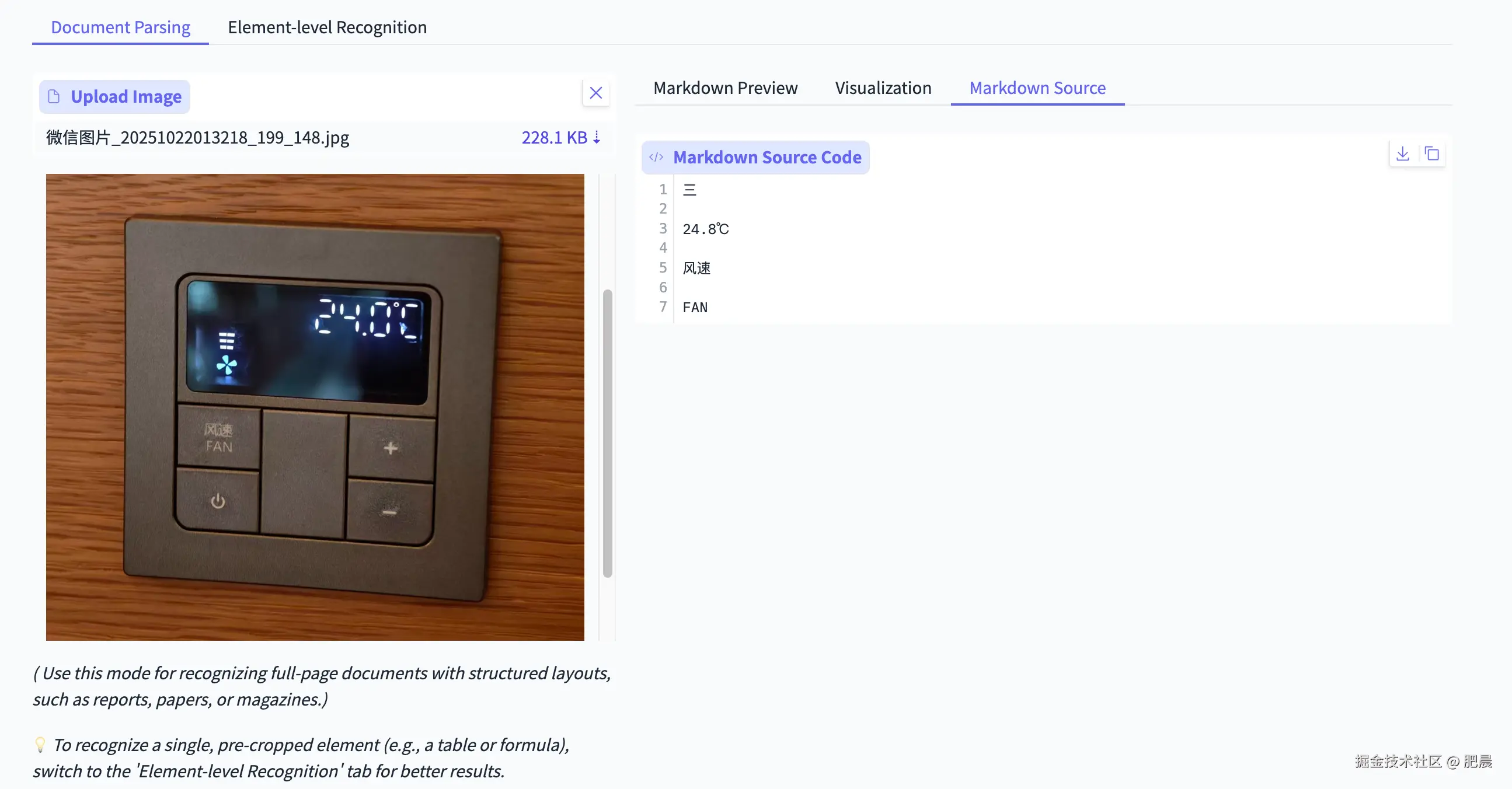 PaddleOCR-VL能识别出显示屏中的大概温度,但小数点后面的数字出错了。三档风速识的icon别成中文“三”。“风速”和“FAN”这个按钮能正确识别出文字,加减号按钮的符号没识别出来。