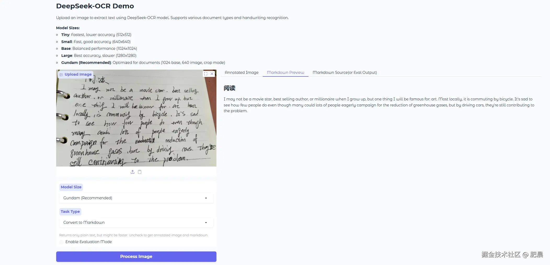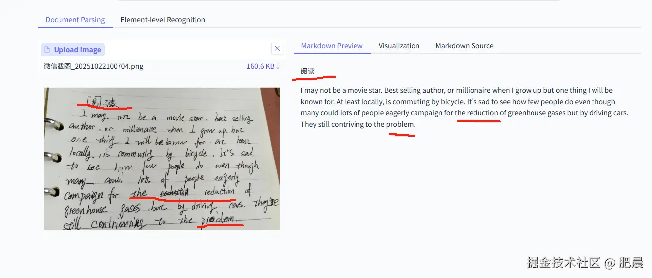 PaddleOCR-VL的展现力非常强,中英文全部读取出来了,并且我写错划掉的也去掉了,下面的单词“problem”写的非常抽象也能读取出来。