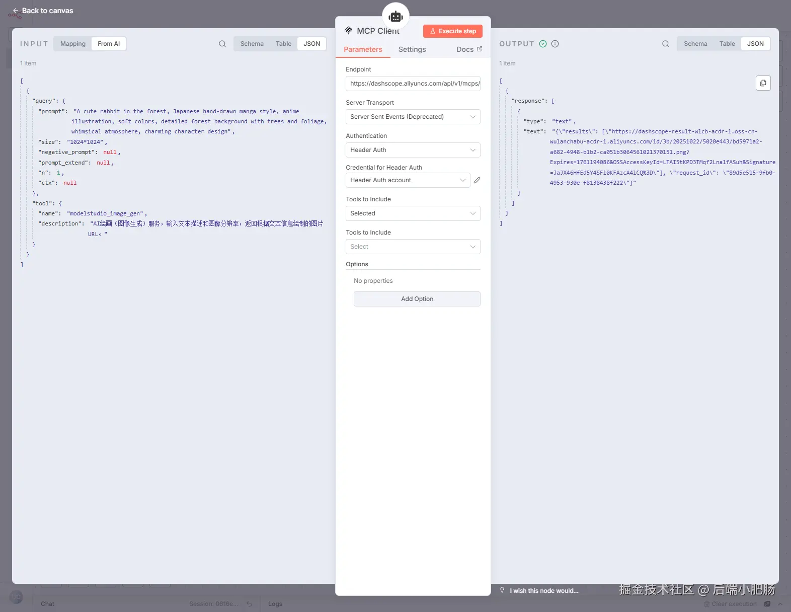 在这里我选择对接阿里云百炼官方图像生成 MCP 服务bailian.console.aliyun.com/?spm=a2c4g.… MCP SDK 调用,** 将SSE Endpoint配置到n8n MCP Client Tool节点中的Endpoint。