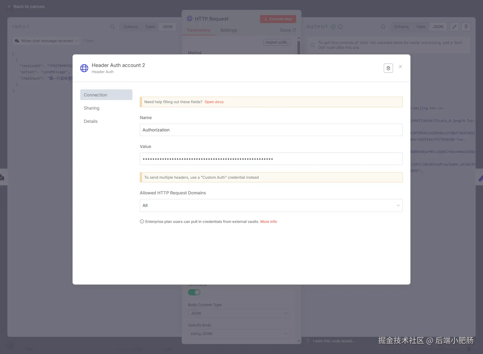 回到n8n MCP Client Tool节点,在Credential for Header Auth点击【Create new credential】,Name设置为Authorization,Value项则将百炼模型的key设置进去即可。