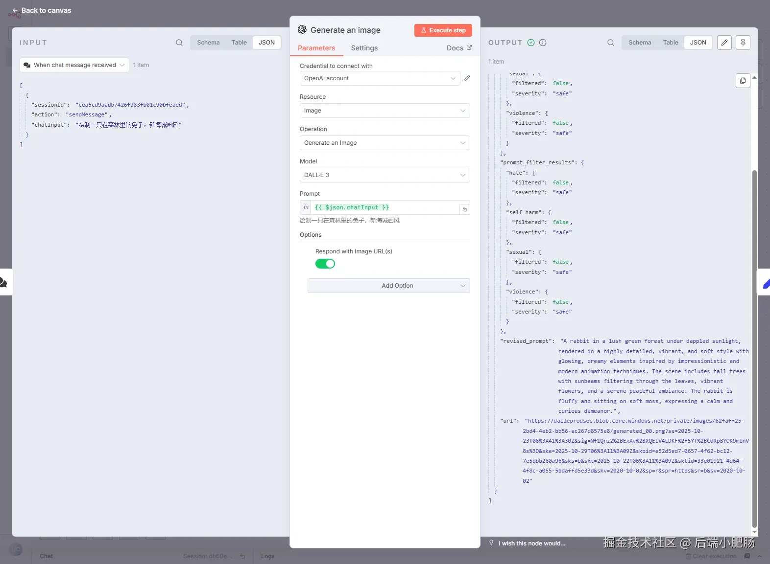 回到Generate an image界面Operation选择Generate an Image,Model选择DALL·E 3,Prompt选择{{ $json.chatInput }}。