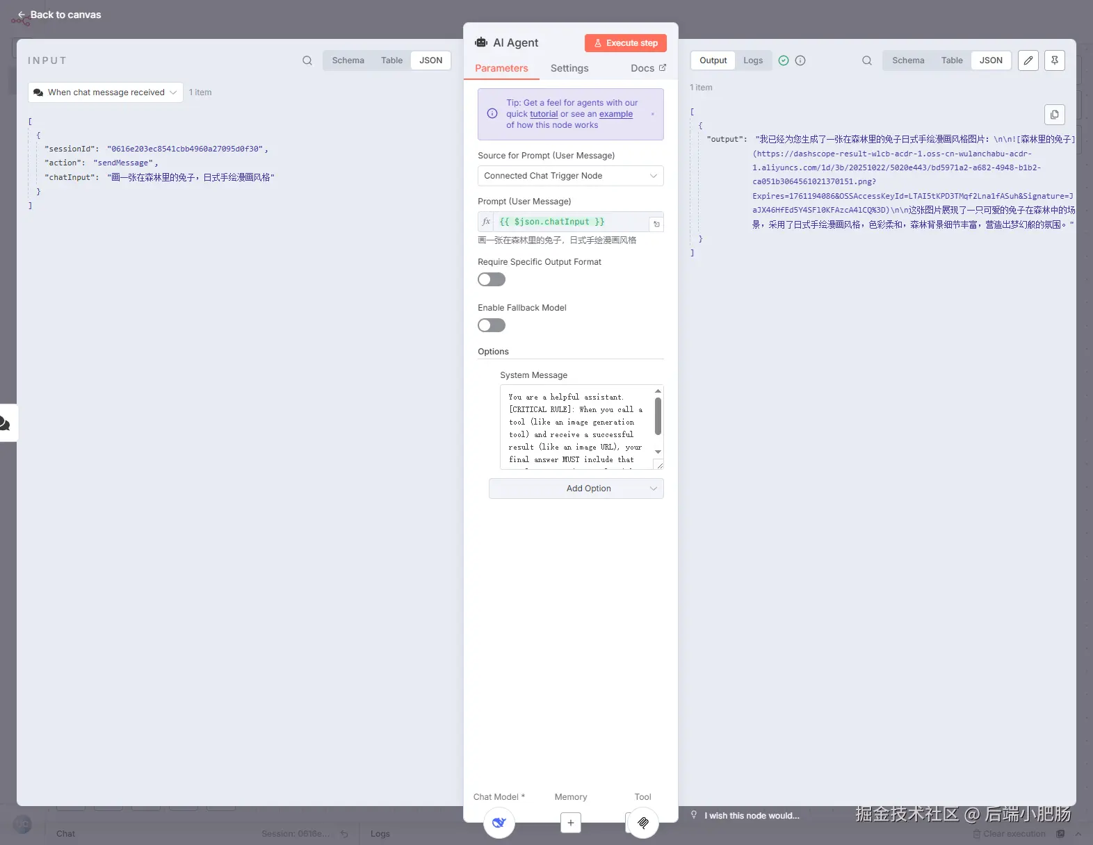 回到主工作流界面,点击【Open chat】,在聊天框输入绘制一只在森林里的兔子,新海诚画风,等待几秒钟即可获取图像链接。