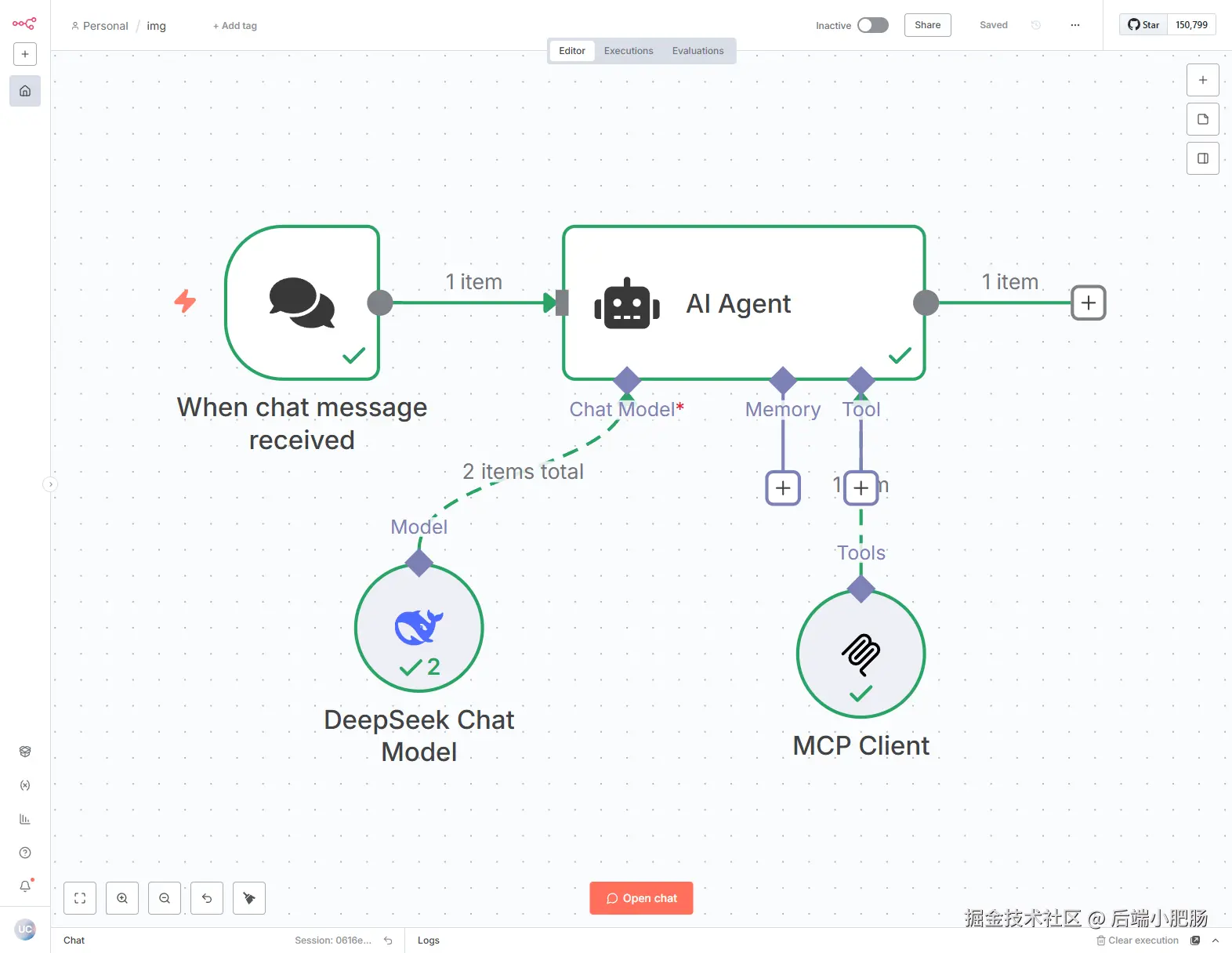 AI Agent—Chat Model配置: 在Chat Model处点击【+】配置大模型,选择DeepSeek Chat Model,在