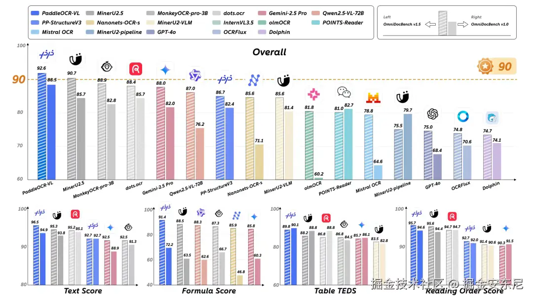 在权威评测基准 OmniBenchDoc V1.5 中,PaddleOCR-VL 以 92.56 分 的综合成绩刷新全球纪录:
