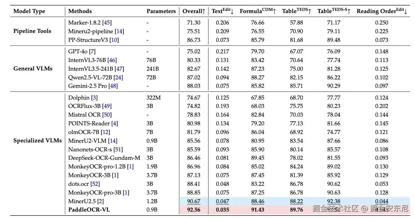 现在,PaddleOCR 的进化版本 —— PaddleOCR-VL,不再满足于识别字符,而是试图理解图像中的语义关系与空间结构。基于百度的 ERNIE-4.5-0.3B 模型训练,总参数量仅 0.9B,却具备解析复杂文档布局、表格结构、数学公式甚至阅读顺序的能力。