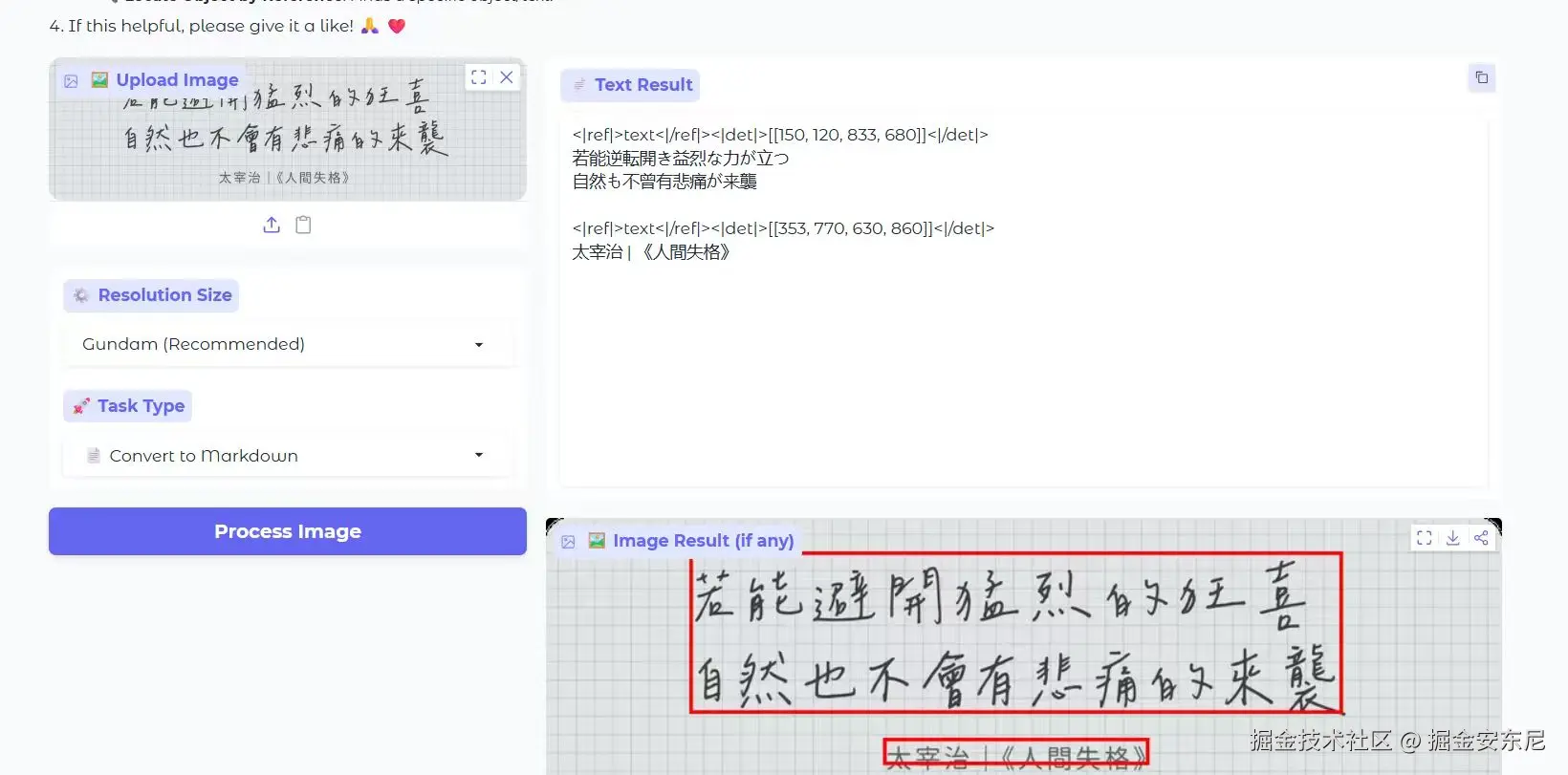 在手写文本识别中,PaddleOCR-VL 能精准地区分文字与方格背景,不仅识别出完整的文字内容,连标点符号也能准确还原。DeepSeek-OCR 则出现了识别偏差,将中文误判为日语。