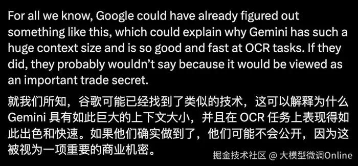 外网爆料猜测,这是“AI的JPEG时刻”,Google可能使用了类似的技术路线使得Gemini具有巨大的上下文大小,同时快速处理OCR任务。