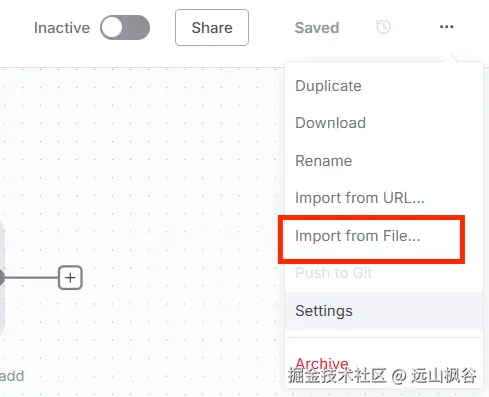 - 随后打开n8n控制台,点击左侧“Workflows”→“Import”;