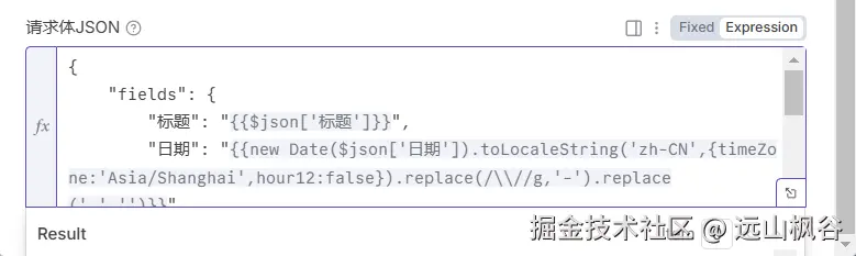 {{ new Date($json['日期']).toLocaleString('zh-CN', { timeZone: 'Asia/Shanghai', hour12: false }).replace(/\//g, '-').replace(',', '') }}(转换为“2024-10-22 14:30:00”格式) - 内容:
