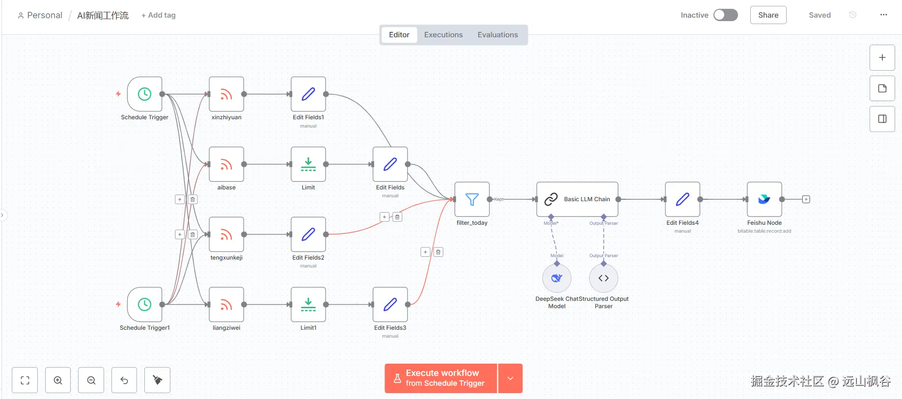 - 定时触发器(7:00/21:00)启动,同时触发4个RSS节点抓取数据;