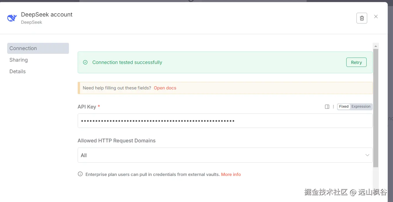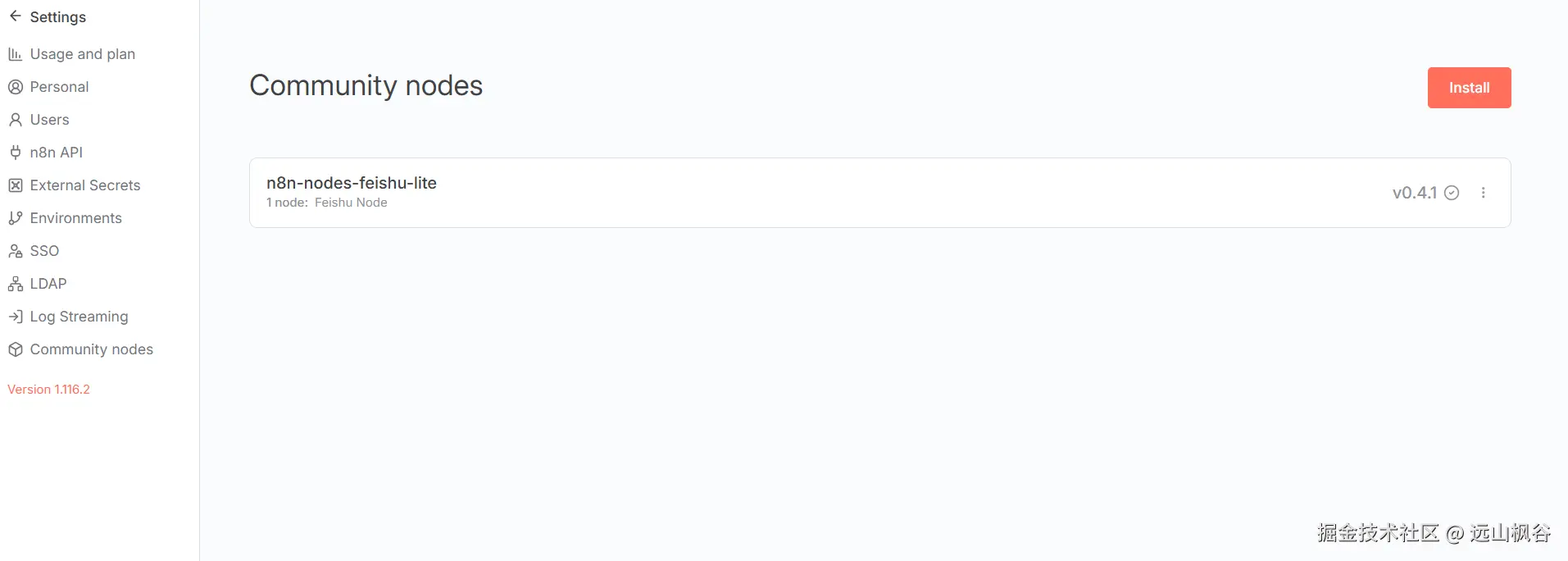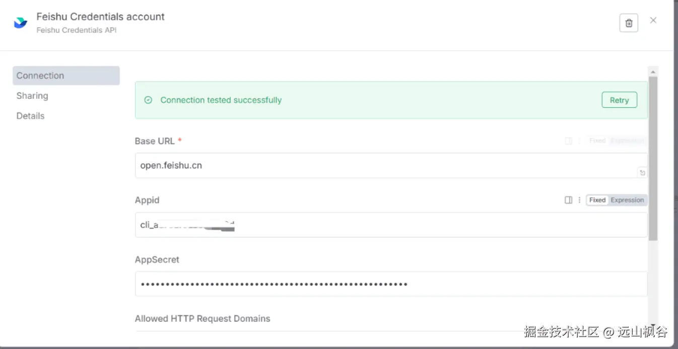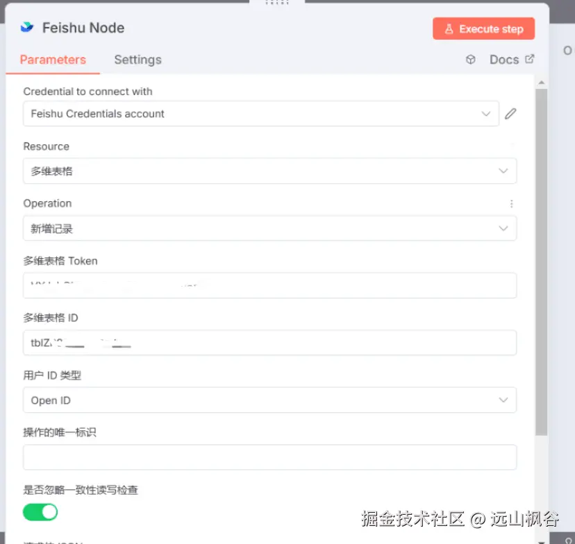 - 随后打开n8n,找到飞书节点,填写飞书配置“App ID”和“App Secret”,