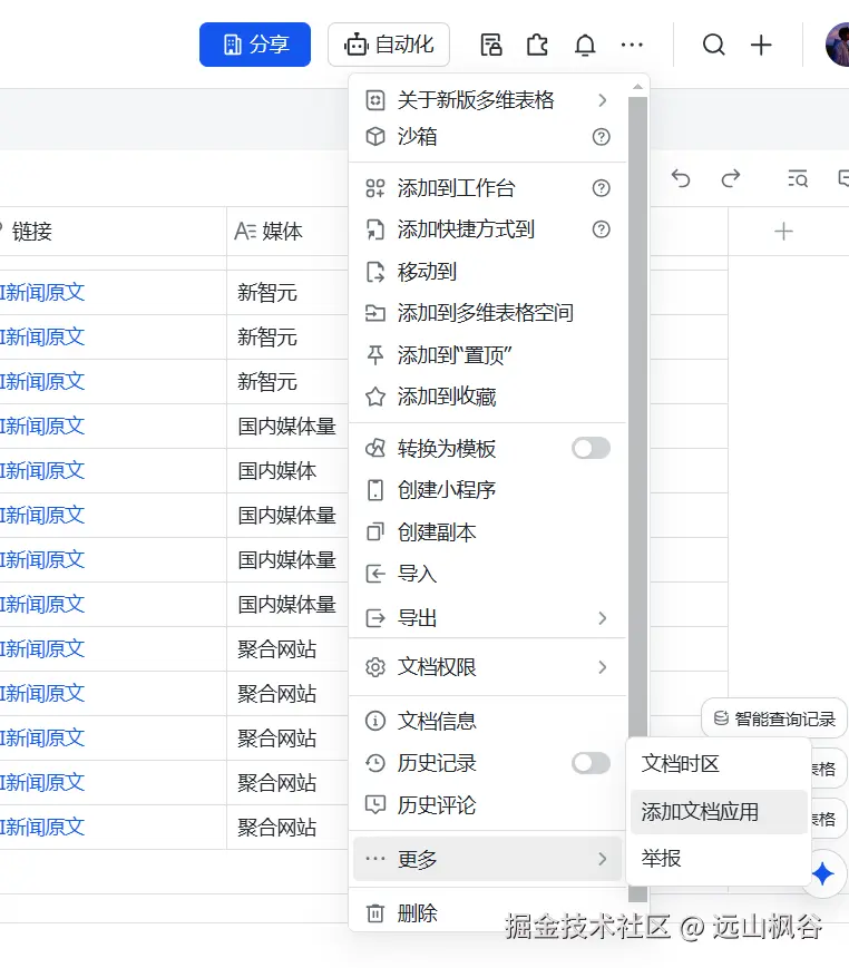 - 随后在右上角三个点处点击更多,找到添加文档应用,搜索自己刚刚配置的应用名,添加上去