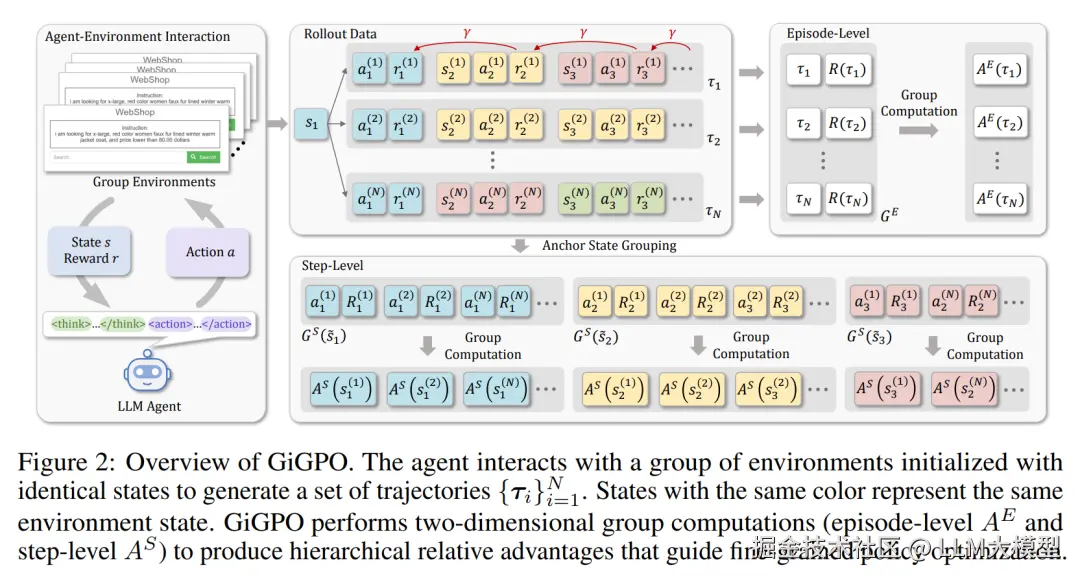 微观层面(step-level):引入“锚状态”(anchor state)分组机制:回溯查找在不同轨迹中反复出现的环境状态(即找到同样一个状态下在不同轨迹中选了不同action的那些anchor state, 找的过程可精确匹配,也可语义匹配),然后将处于相同锚状态下所采取的动作归为一组。基于该组,计算“微相对优势”(micro relative advantage),即仅在这一锚状态对应的动作 token 上计算损失(loss),从而让训练算法能够更精准地辨识“哪些具体步骤对最终结果贡献最大”。