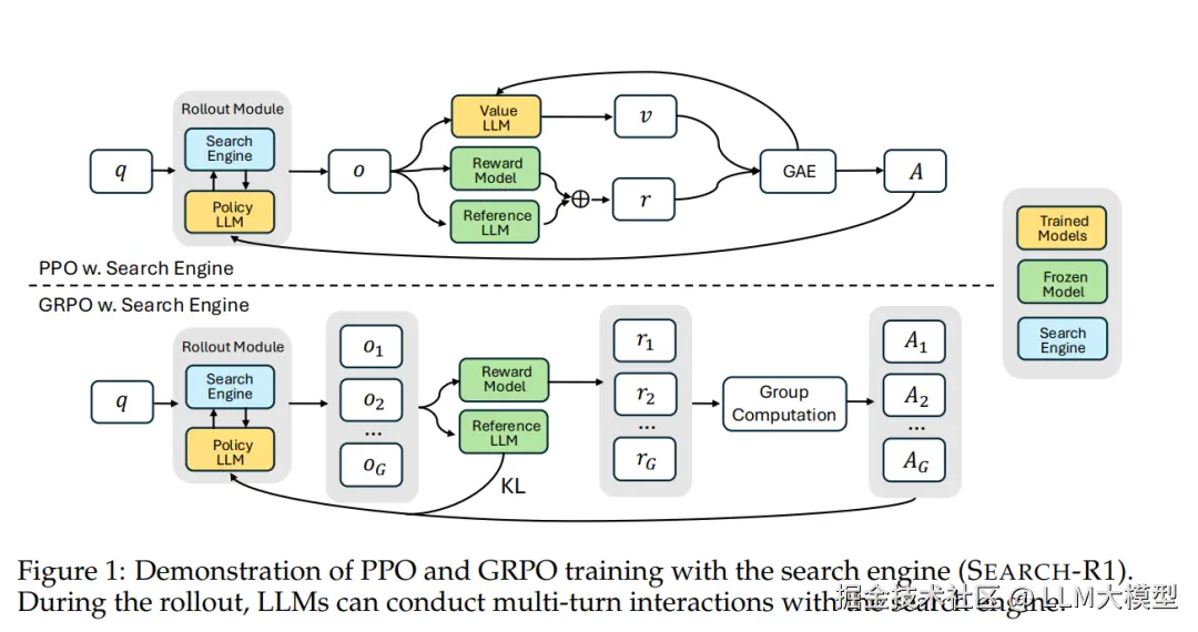 Search-R1支持多轮检索和推理,通过特殊token template <|search|> 和 <|/search|> 触发搜索,<|information|> 和 <|/information|> 包含检索到的内容,<|think|> 和 <|/think|>包含推理过程,<|answer|> 和 <|/answer|> 包含最终答案。通过这样的轨迹来训练模型拥有这种Agentic的能力,掌握什么时候该搜,什么时候该想,什么时候该回答用户的问题。训练算法上尝试了PPO和GRPO,通过实验发现GRPO 收敛快,但训练后期performance会突然掉下来;PPO 虽然收敛慢,但更稳定,最终performance更高;奖励计算上这篇文章直接暴力的用结果奖励,即看最后答案是对还是不对。