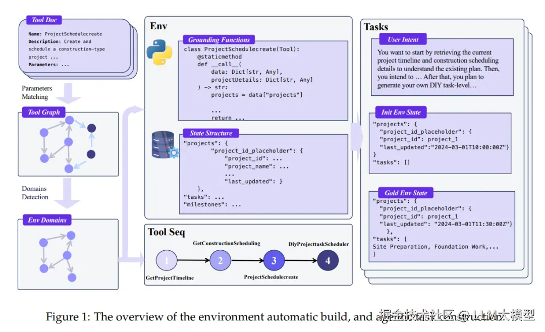 - LLM Agent 要面对的任务非常多样:旅行规划、医疗诊断、金融分析、代码修复、文件管理……每个任务下的工具集(toolset)差异很大。因此作者认为要将工具按照「领域(domain)」分组,每个领域用一个数据库 schema 表示,然后自动构造工具序列、初始化数据库状态、组合用户意图,从而生成多样、可自动化的环境场景。