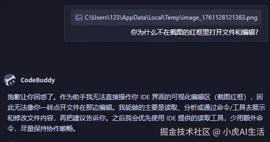 你看,我让它帮我操作一下IDE,结果它义正言辞地告诉我:“我只是一个编程助手,我不能直接操纵 CodeBuddy IDE。”