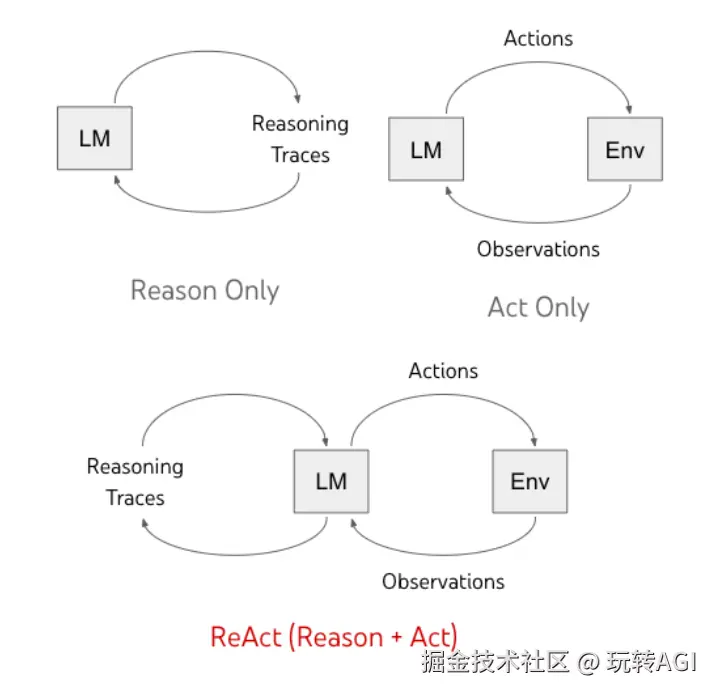 紧接着,研究者开始探索如何让 LLM 不仅会「想」也会「做」,于是出现了将推理和行动交织的架构(后面详述的 ReAct 等),赋予模型调用工具、与外界交互的能力 。