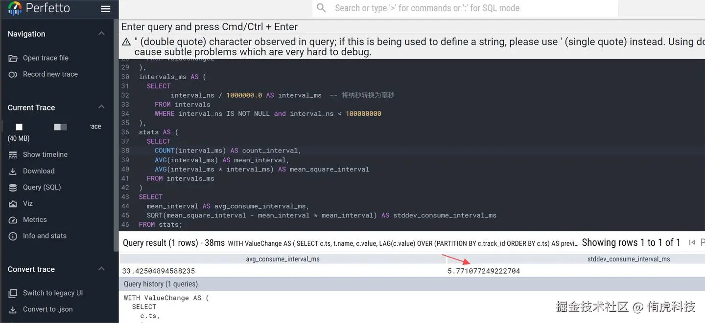 Perfetto生成的Trace文件可以通过SQL进行统计。笔者统计了每次BufferQueue减少时的时间点,进一步计算了这些时间间隔的标准差。该指标可用于量化画面抖动的严重程度,为后续方案对比与优化提供了数据基础。