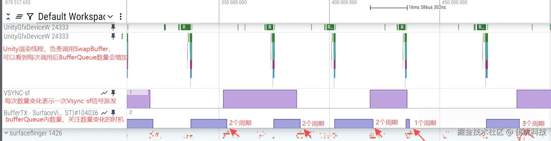 这里筛选出了Trace数据中相关的轨道,从BufferQueue里面可以看到大多数情况是2个周期消耗一次,偶尔会有1、3个周期出现。