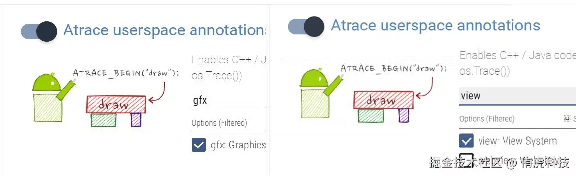 Perfetto有一些配置,针对画面抖动问题需要确认开启ATrace的gfx、view模块:
