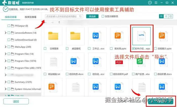 步骤2: 在扫描出来的文件中寻找需要恢复的文件,用户可以单选一个文件也可以直接多选,找不到文件还可以选择使用 “搜索框”“筛选器” 等搜索工具准确找到文件;选中文件后点击右下角的“导出”按钮,选好文件恢复后存放的位置,完成恢复。