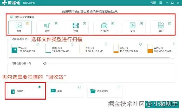 步骤1: 打开数据 蛙,进入软件首页,在上面选择自己需要恢复的文件类型和选择需要扫描的位置(C盘/回收站),按下“扫描”按钮让软件进行扫描工作;
