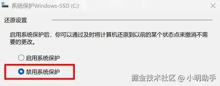 步骤2: 点击“配置”后,在上面选择“关闭系统保护”。