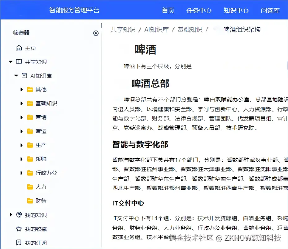 知识架构采用“多知识空间→多级文件夹→多类型文档”树形结构,支持多类型文档管理,并通过权限控制保障信息安全与获取效率。