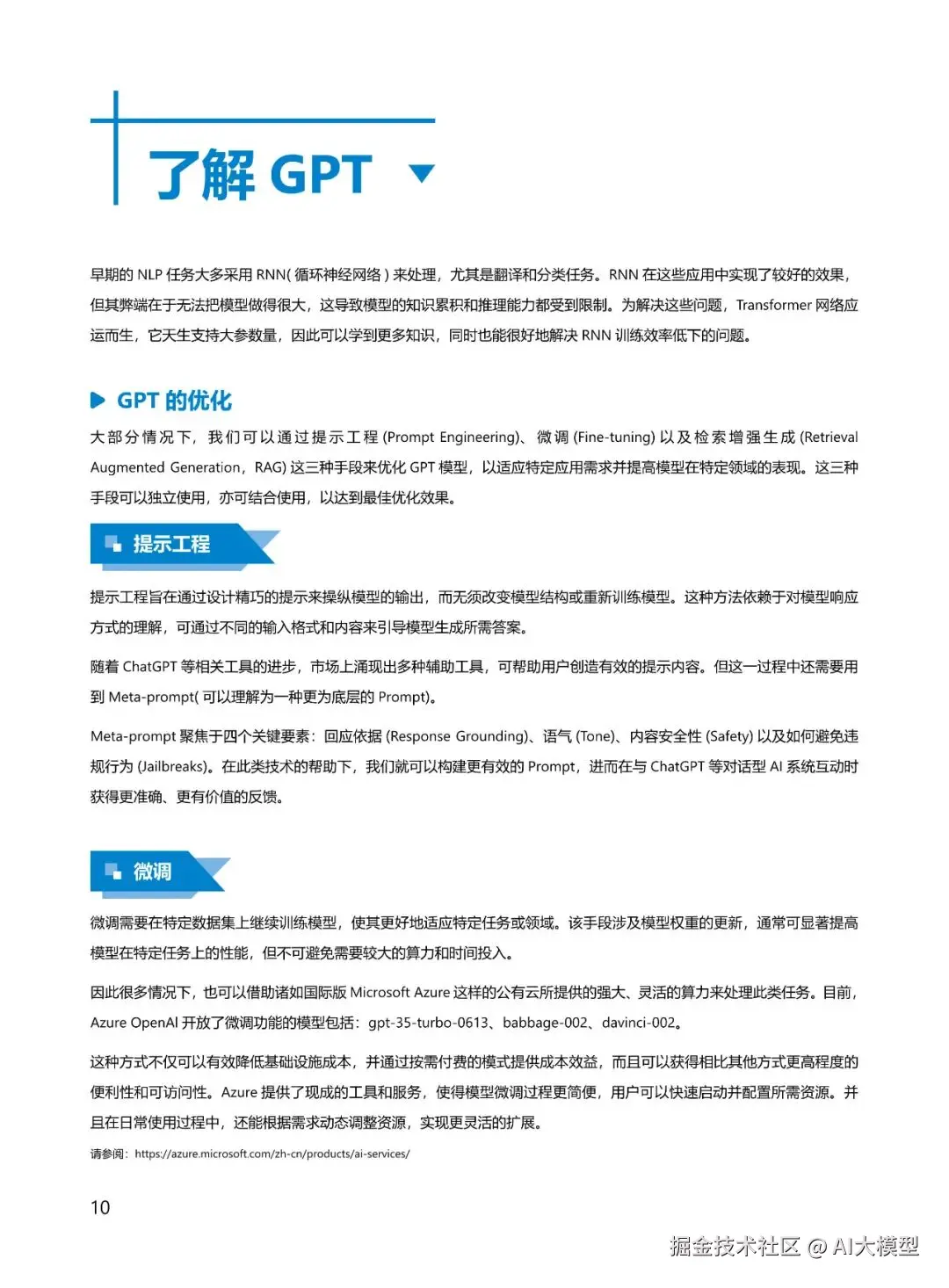 - 了解GPT:可通过提示工程、微调、检索增强生成(RAG)优化GPT模型。提示工程设计提示引导输出;微调在特定数据集训练模型;RAG借助检索增强回复准确性。GPT应用广泛,如基于RAG的知识库能处理新知识、特定领域及长尾问题,还可优化电商详情页,在智能体和多智能体开发中也有应用 。