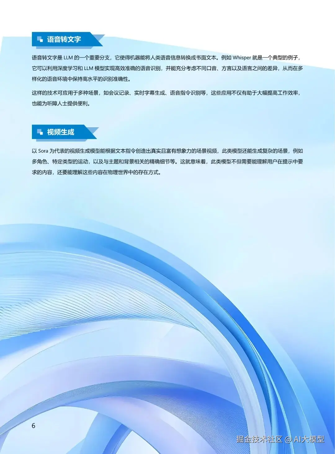 - 了解大语言模型:LLM的“大”体现在参数数量多、需大量训练数据和计算资源。其发展历经统计语言模型、基于RNN和LSTM的技术,至2018年BERT诞生进入预训练语言模型时代。LLM核心应用于内容创作、摘要生成、代码生成和语义搜索,多模态LLM还能实现文生图、图片与视频理解、视频生成等功能 。