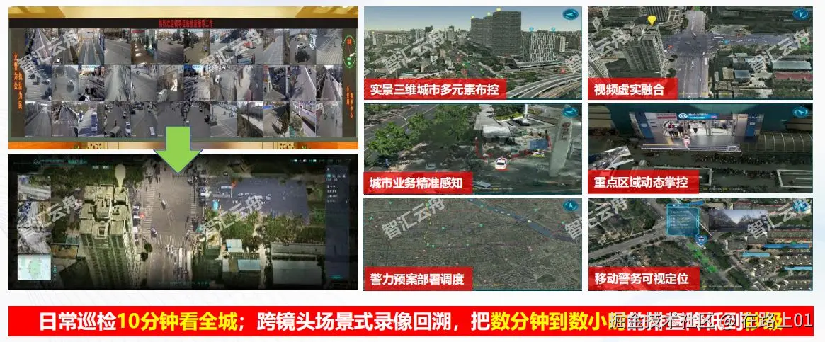 智汇云舟科技,围绕50平方公里区域、4W路视频城市核心区域范围,针对日常视频巡视、警情处置等各类社会治安突出问题,应用视频孪生技术,将传统 的二维GIS平台升级为真三维GIS平台,建设1.5TB倾斜摄影数据,打造360°全方位立体实时实景指挥系统。实现驾驶舱视角,拉齐全员认知,一 目了然全局掌控,指哪打哪;全城移动警力,一体感知调度;应用统一计算能力,彻底解决数据孤岛。
