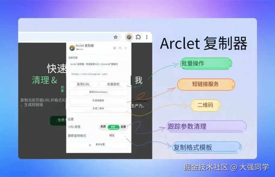 快速复制当前页面 URL,可一键生成 Markdown、短链与二维码。