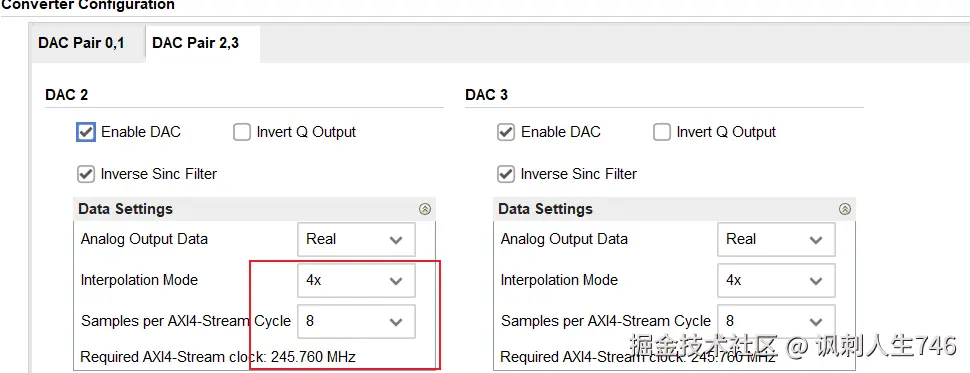 以DAC为例,整个数据通路是这样工作的,例如DDS在FPGA 在每个 AXI 时钟周期(245.76 MHz)送出个 个样点,然后RFDC 的 Interpolation Filter将每个样点插值成 倍;插值后的采样流被送往 DAC 核心,运行在 时钟下;这样就实现了从 FPGA 低速到 DAC 高速的时域扩展,ADC则是反过来同理