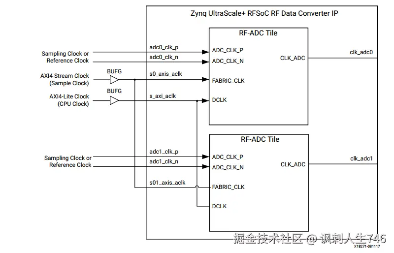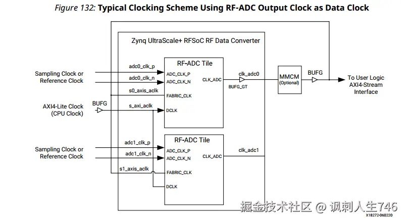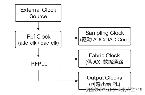 sysref clk: 由PL产生,用于多通道同步,这个信号很重要,所有的ADC/DAC tile需通过sysref信号进行时间对齐,这个信号通常很小,是上述所有信号的公约数,大概在10MHz以内,后面讲多片时钟同步的时候会着重讲到这个信号