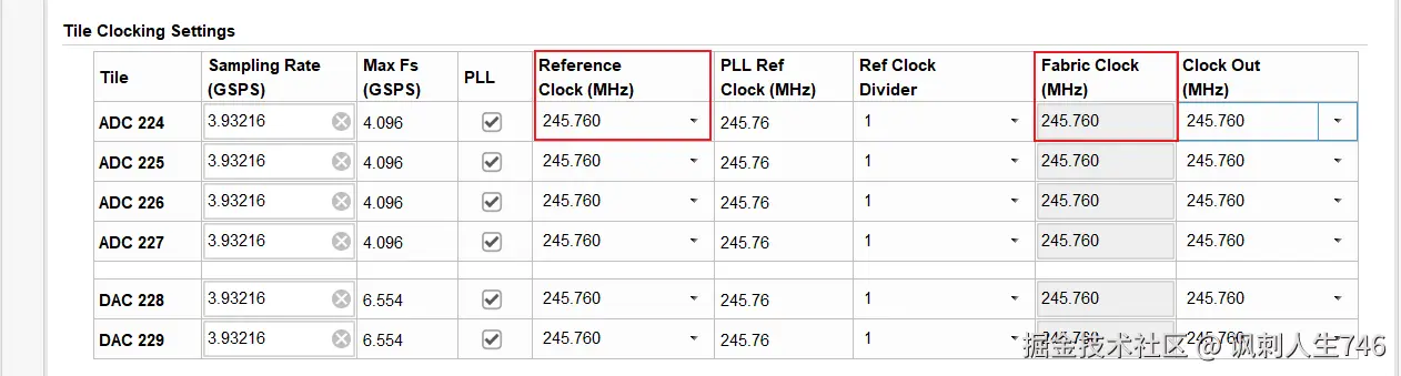 Fabric clk: 这是在所选tile的AXI流时钟输入上提供的时钟频率。由采样速率配置中的设置确定。由于所有tile上的所有AXI流端口共享一个公共AXI流时钟,因此所有fabric clk配置必须要求相同。其值计算方法为