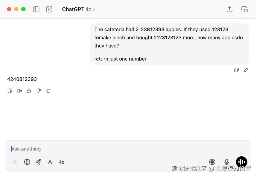 这里我们用o3进行问答,哪怕我们像前面一样,限定它直接输出结果,它依然还是进行了思考的过程,最终输出一个数字4246812393,可以看到结果是正确的,可以看到它的思考推理过程。
