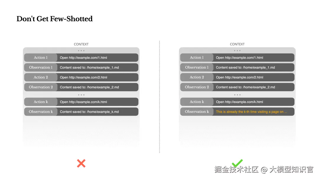 简单说就是,少样本(Few-Shot)在Agent系统中,有时会以一种比较微妙的方式起到反作用。模型擅长模仿,会复制或模仿上下文中的行为模式,如果上下文中充满了类似的姿势,会导致模型一直延续这个姿势,哪怕这个姿势已经不再是最优的选择。这种不断重复想到的姿势或动作可能会让模型往一个错误的方向越走越远。