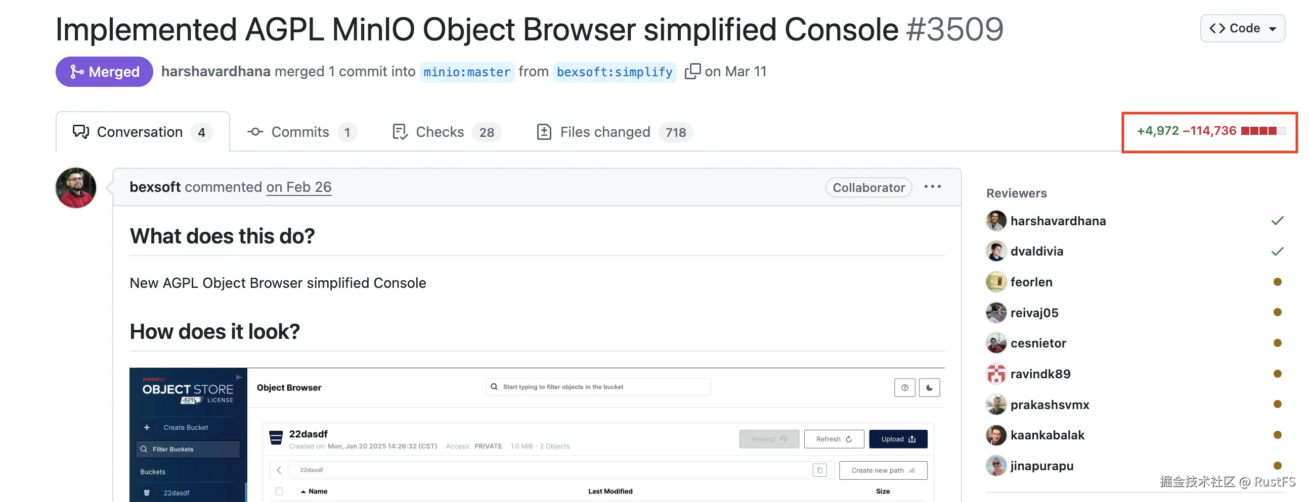 在今年五月份,MinIO 在主题为 Implemented AGPL MinIO Object Browser simplified Console 的 PR(目前该 PR 仅限于协作者才可完整查看) 中提交了大量的代码,对 UI 页面上的 admin 功能进行了删除,整个 PR 删除代码达到 11w+ 行,增加超 4k 行: