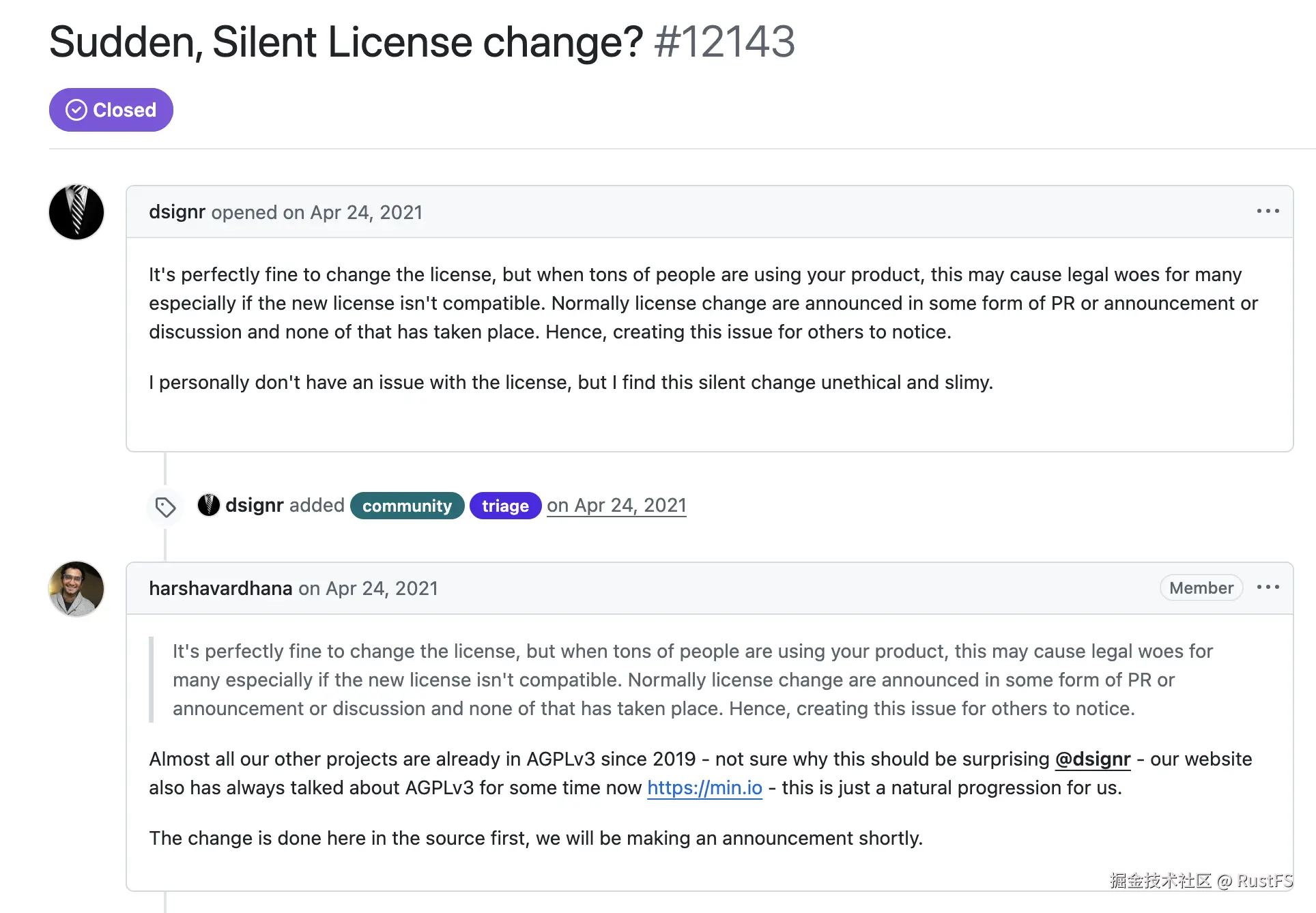 博客中也提到,MinIO 其实从 2019 年开始就着手做许可证修改的事情了,到 2011 年已经完成了代码的梳理,后续绝大部分 MinIO 相关的代码都以 AGPLv3 进行分发。对于许可证修改的事情,在 MinIO GitHub 的 Issue 上也讨论的很热烈: