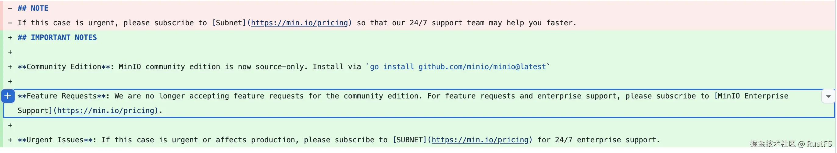 里面写到:如果你想使用 MinIO 社区版,要么从源码安装(官方推荐),要么使用官方提供的 Dockerfile 自行编译构建。而且此 commit 修改的其他文件中也写了,社区版从此以后就不再接受功能请求了: