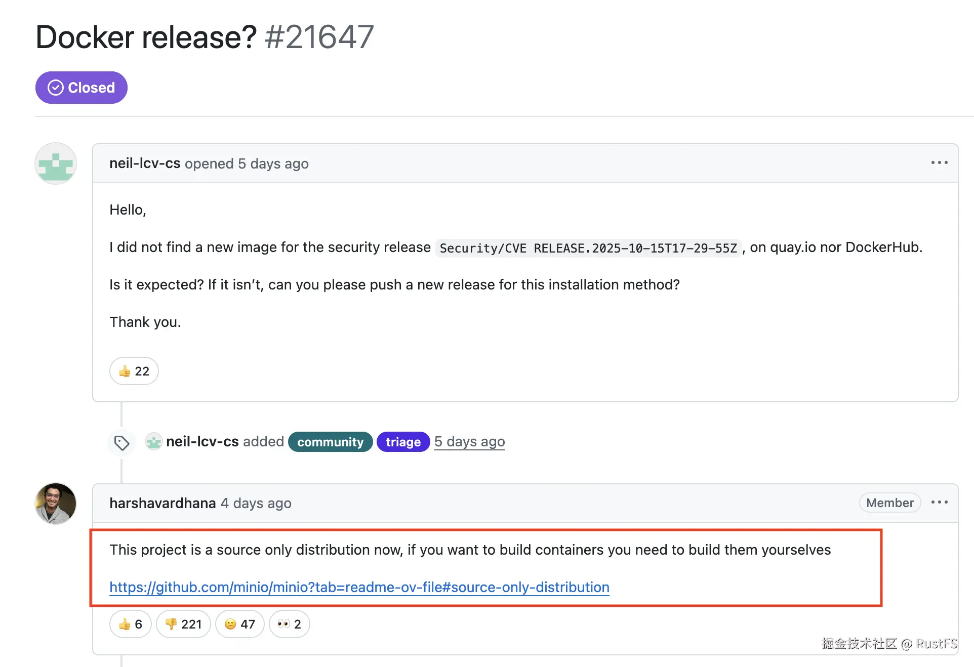 在 MinIO 的 GitHub Issue 中看了一下,有用户提了一个关于 Docker release missing 的 issue,里面写到他找不到关于安全版本 Security/CVE RELEASE.2025-10-15T17-29-55Z 这个版本的 Docker image 了,一名 GitHub ID 为 harshavardhana 的 MinIO 员工,回复到**这个项目现在仅分发源代码了,如果需要 docker image 就得自行构建了。